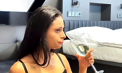 Big-orb brunette drinks pee and fondles herself